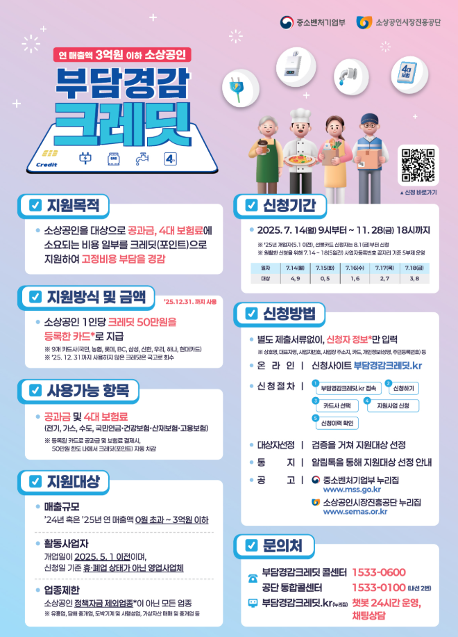 - 지원대상 : 개업일이 25년 5월 1일 이전 사업자, 24년 또는 25년 연 매출액 0원 초과 3억원 이하 소상공인